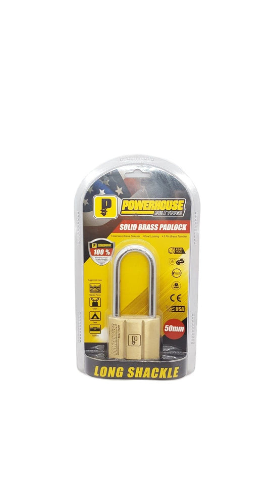 POWERHOUSE 50MM" Solid Brass Padlock (Long Shackle) for Gate, Chain and Tool Box