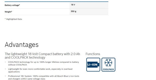BOSCH GBA 18V 2.0Ah M-B Slide Pack Lithium Ion Battery